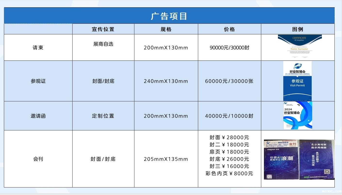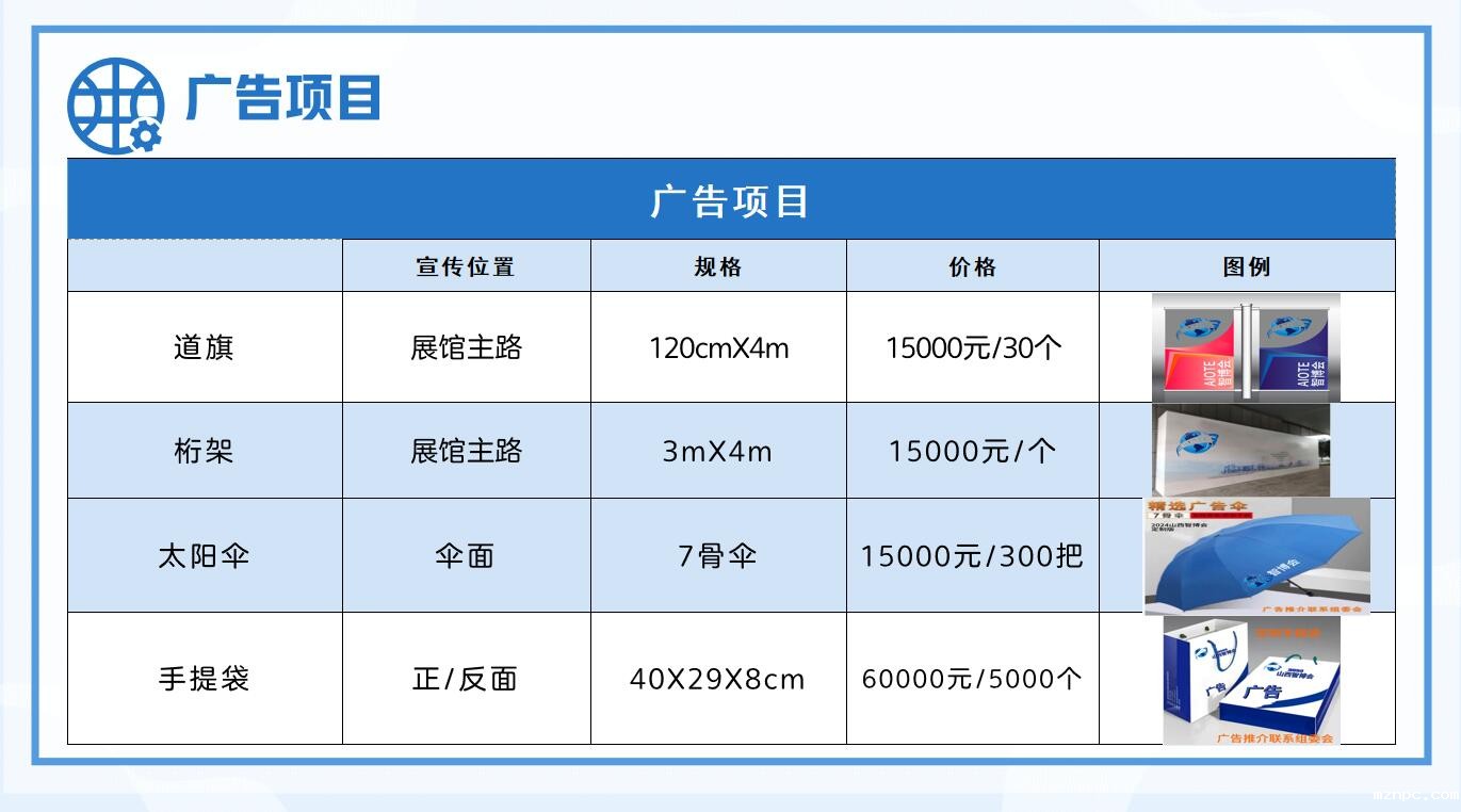 1、标准展台:3㎡×3㎡=9㎡;标准展位:18000RMB/个;国际展商:3000USD/个;标准展位包括地毯、三面围板、公司名称楣板、咨询桌一张、椅子两把、射灯两盏、电源插座一个(特殊用电请事先说明,展馆另行收费)。